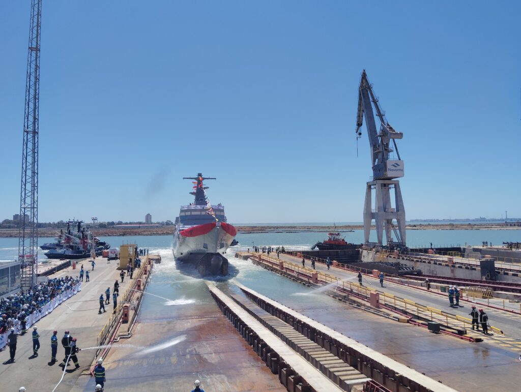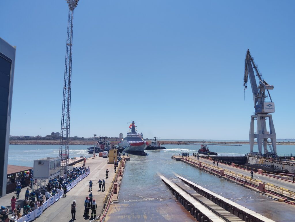 Por ello, el acto institucional celebrado en el astillero de Navantia en San Fernando (navantia.es) lleva aparejada la recuperación de unas relaciones institucionales y comerciales que, hasta la fecha, se puede catalogar que se encontraban en ‘modo de espera’. Y esa espera ha concluido en el momento en el que el director del Negocio de Corbetas y Buques de Acción Marítima de Navantia, Alberto Cervantes, y el comodoro de la Marina Real de Marruecos, capitán de navío mayor, Mohammed El Fadili, han apretado el dispositivo que permitía que este nuevo patrullero de altura (también se le puede catalogar como corbeta) se deslizara suavemente sobre la grada número 3 del astillero para introducirse en las aguas de los caños de la Bahía de Cádiz, auxiliado por cuatro remolcadores.