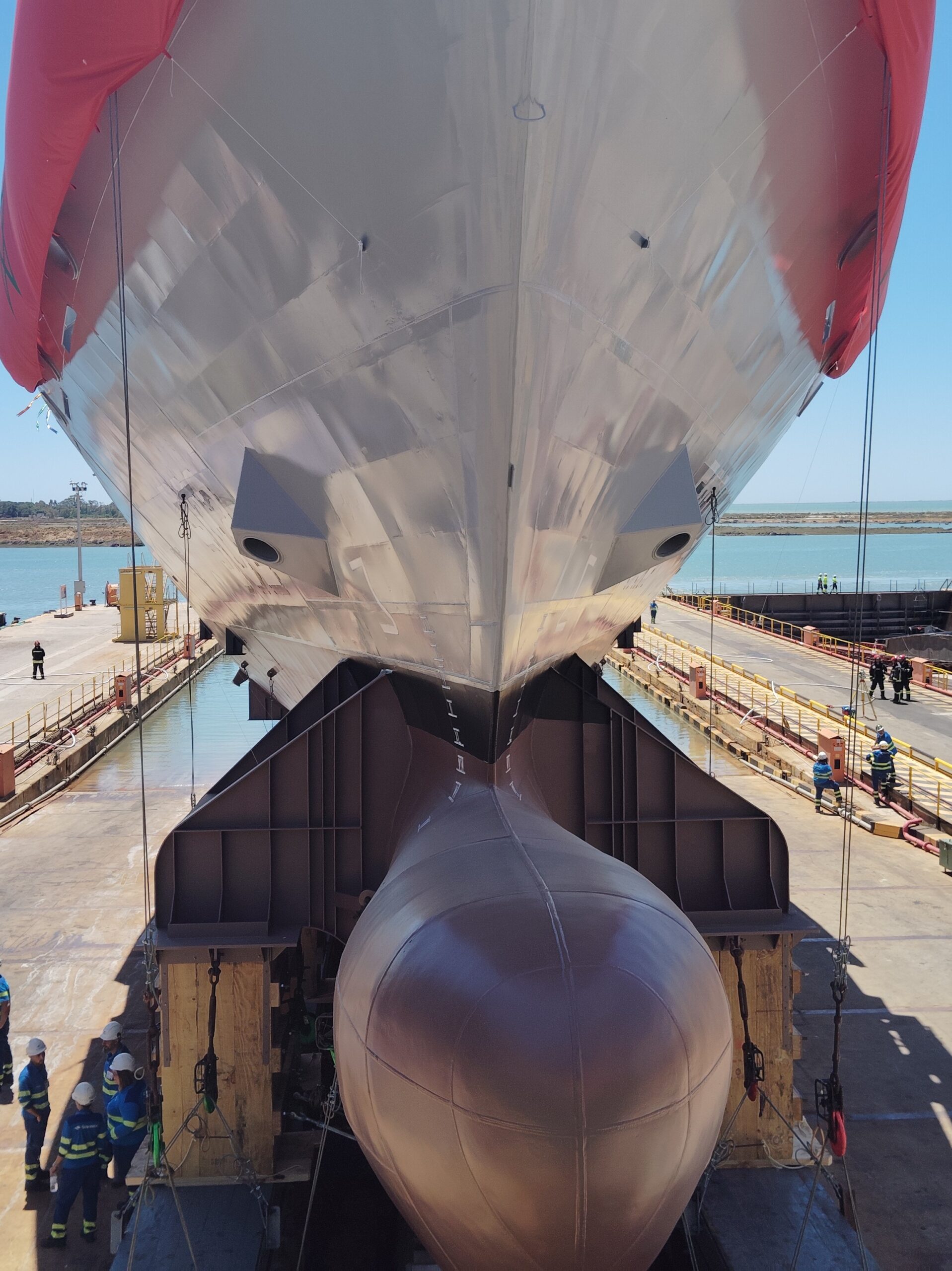 Por ello, el acto institucional celebrado en el astillero de Navantia en San Fernando (navantia.es) lleva aparejada la recuperación de unas relaciones institucionales y comerciales que, hasta la fecha, se puede catalogar que se encontraban en ‘modo de espera’. Y esa espera ha concluido en el momento en el que el director del Negocio de Corbetas y Buques de Acción Marítima de Navantia, Alberto Cervantes, y el comodoro de la Marina Real de Marruecos, capitán de navío mayor, Mohammed El Fadili, han apretado el dispositivo que permitía que este nuevo patrullero de altura (también se le puede catalogar como corbeta) se deslizara suavemente sobre la grada número 3 del astillero para introducirse en las aguas de los caños de la Bahía de Cádiz, auxiliado por cuatro remolcadores.