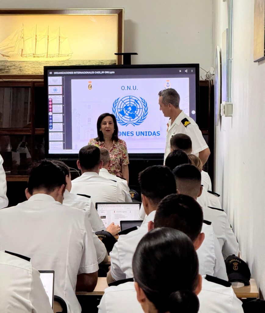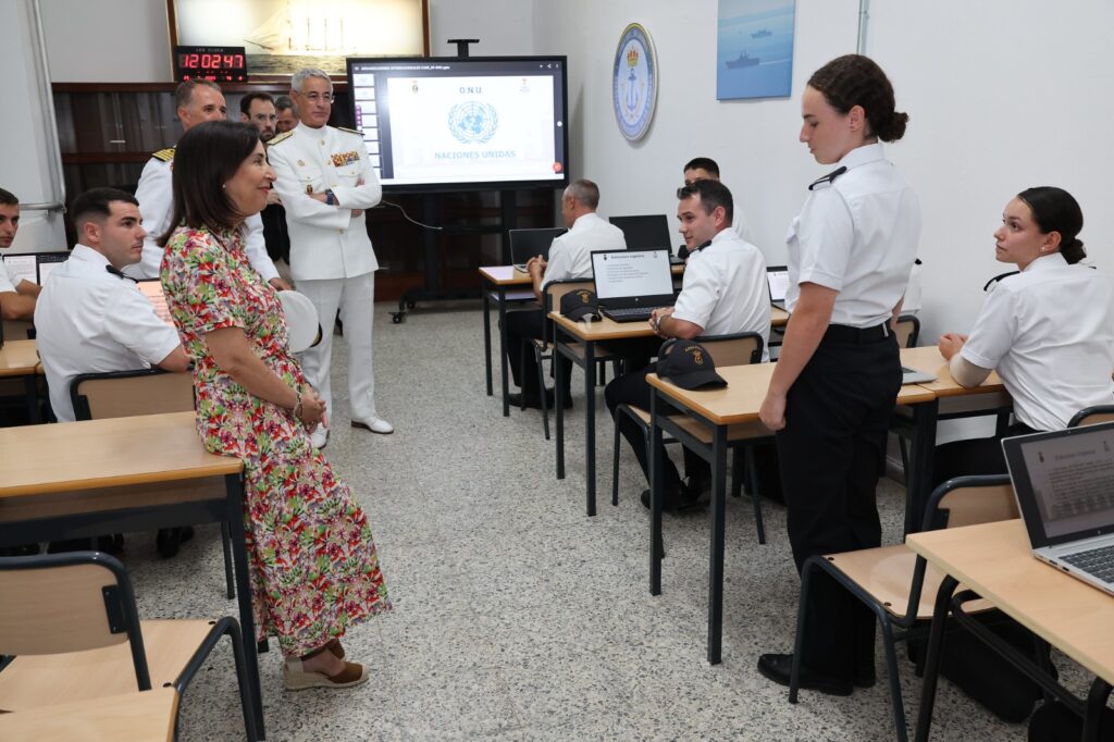 En las instalaciones de este edificio histórico, en las que se han formado los marinos españoles desde 1798, la titular de Defensa ha visitado un aula en la que ha podido departir con los alumnos sobre el papel de España en las misiones internacionales, como la de Líbano o la Policía Aérea del Báltico, entre otras. Allí, Margarita Robles, quien ha estado acompañada por la subsecretaria de Defensa, Adoración Mateos Tejada; la subdelegada del Gobierno en Cádiz, Blanca del Pilar Flores Cueto; el Almirante Jefe de Estado Mayor de la Armada (AJEMA), almirante General Antonio Piñeiro Sánchez; y el comandante-director de la ESUBO, capitán de Navío David Durán Mayoral, entre otros altos mandos ministeriales y de la propia Armada, ha destacado el compromiso de los militares españoles con organismos e instituciones como la ONU, la OTAN y la UE, «allí donde hace falta, y en estos momentos tan complicados».