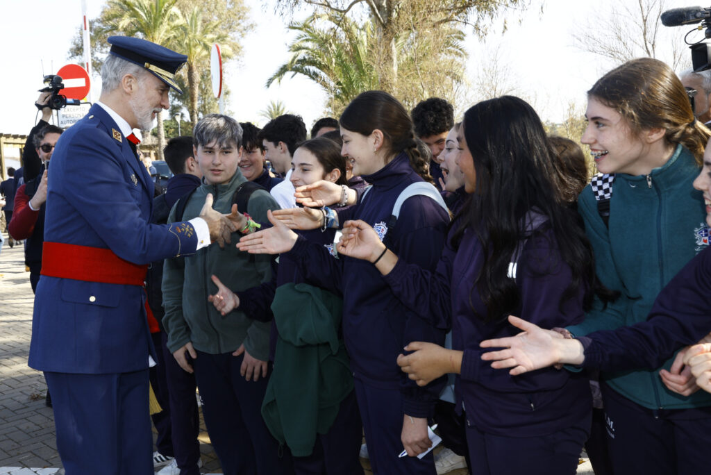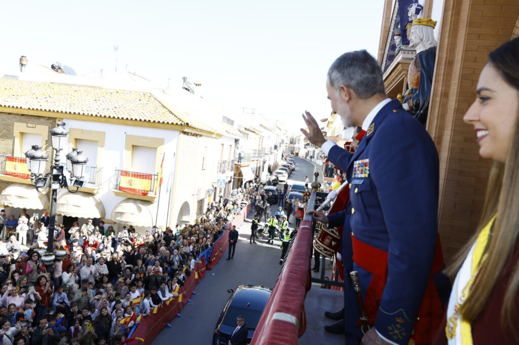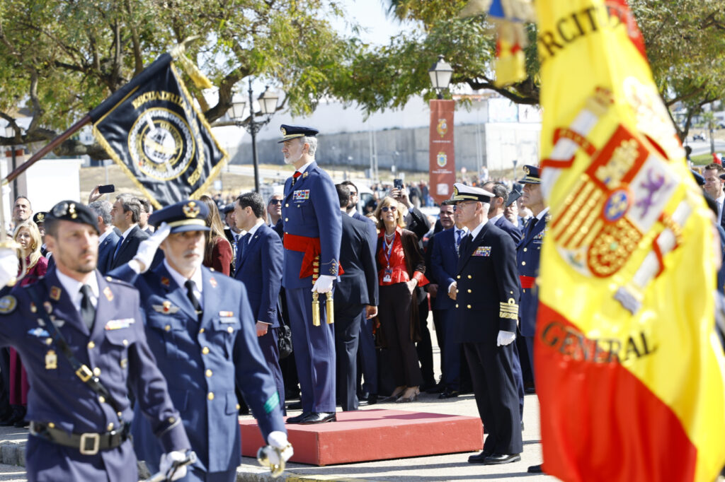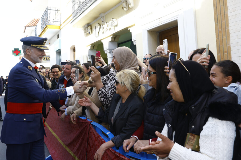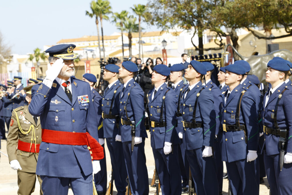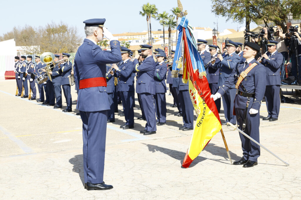 Posteriormente, se ha celebrado un acto en el exterior de las Casas Consistoriales, que ha comenzado con los honores de ordenanza a SM, a cargo de una compañía de honores del Ejército del Aire con escuadra de gastadores, Bandera del Cuartel General del EA, banda de música y varias secciones del EA. A continuación, el Rey ha saludado a las autoridades civiles y militares.